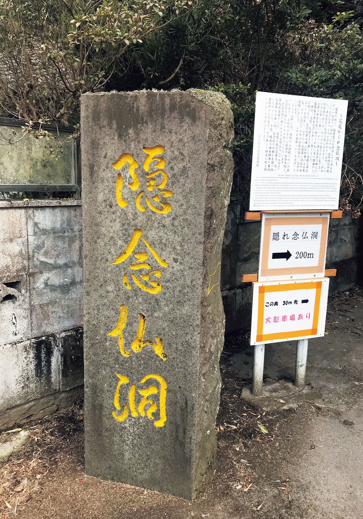 鹿児島市花尾町にある「花尾隠れ念仏洞」。道路から山道を約200m登っていくと、高さは約1.4mの洞穴があります。入口は三角形で洞穴の奥は8帖ほどのスペースとなっています。浄土真宗の禁制が解かれるまで仏像や仏具を隠し、お念仏を称えていたと伝えられています。