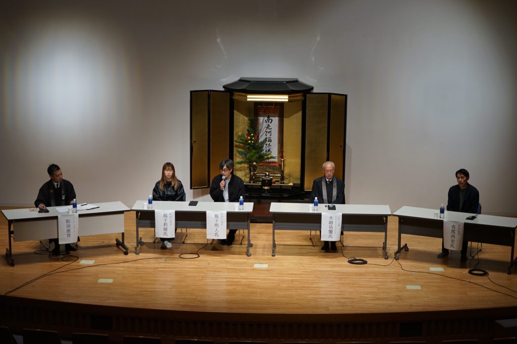 上映会後のシンポジウムでは、有馬尚史氏(映画監督)、瓶子明人氏と娘の莉緒氏(映画出演者)、木越祐馨氏(能登教区光琳寺・加能地域史研究会代表委員)が登壇。仮設商店街で理髪店を営む瓶子明人氏は、地元珠洲市の「正院町未来会議」の共同代表を務めており「人もいなくなり、何もない状態だが、いい町をつくっていきたい。復興のためには祭りを絶対に無くしてはいけない」と語られ、現在金沢で大学に通う莉緒氏からも「自分も友だちも能登が大好き」とふるさとへの思いが語られました。こうした祭りに代表される文化の復興を通して、真宗文化や地域コミュニティの今後について考える機縁とすることが願われたシンポジウムでは、最後に木越氏から、地域の復興と共に、一人ひとりが自分の生き方を取り戻していくために、仏事や寺院の再興が不可欠であろうと語られました。