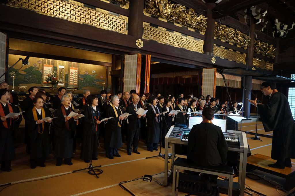 法要では、北海道大谷室蘭高等学校の生徒・教員七名を含む計54名の合唱団が参加し、参拝者と共に勤められるよう編成された音楽法要曲(新実徳英氏作曲)を用い、法要を荘厳しました。