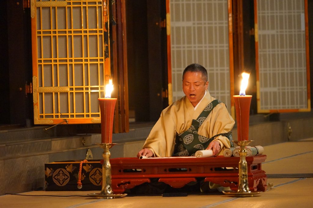 25日の夕刻には、御影堂で親鸞聖人のご生涯を伝える伝記『御伝鈔』の拝読があり、参拝者は聖人の生涯の歩みに耳を傾けました。また27日の結願逮夜後には、「御俗姓」が拝読されました。