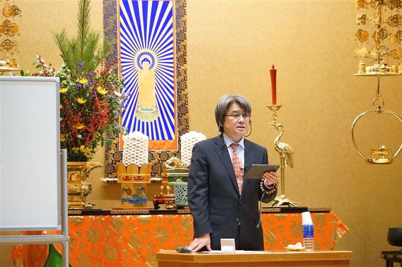 福田氏は「釈子畢罪(しゃくしひつざい)の時、仏もまた頭痛す」と題し、依然として戦火の止まない現代社会において、仏教がいかにして戦争のない理想世界への願いを織りなしてきたのか、そしてその歴史から私たちは何を読み取るべきなのかを講演されました。講演では、釈迦族の王子として生まれた釈尊が侵略によって釈迦族が滅亡した際に頭痛をしたとする伝記や、戦わずして世界を治める理想的君主「転輪聖王」を紹介され、その歴史から願われてきた平和について話されました。そして、近代的知性によって平和を築こうとする現代の私たちに対し、「信受」という言葉が突き付けられているのではないかと述べられました。