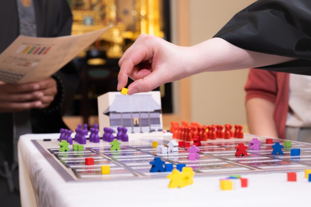 「別院会議」は、別院・寺院の持続可能な運営について議論するシリアスボードゲームで、参加者が架空の別院の運営メンバーとなり、24枚の行動カードを道しるべにチームで方針を議論することで、地域における別院の在り方や方向性を探る内容となっています。