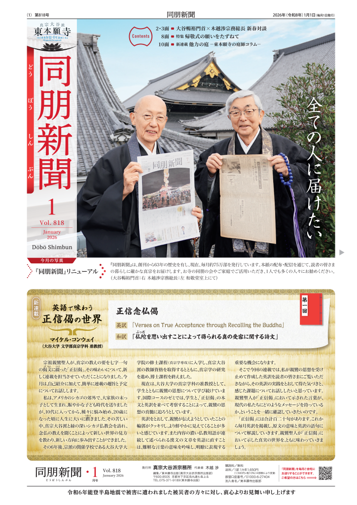 真宗同朋会の機関紙として毎月発行している『同朋新聞』が、2026年1月号よりデザインを新たにリニューアルし、紙面構成が8面から12面へ変更となりました。