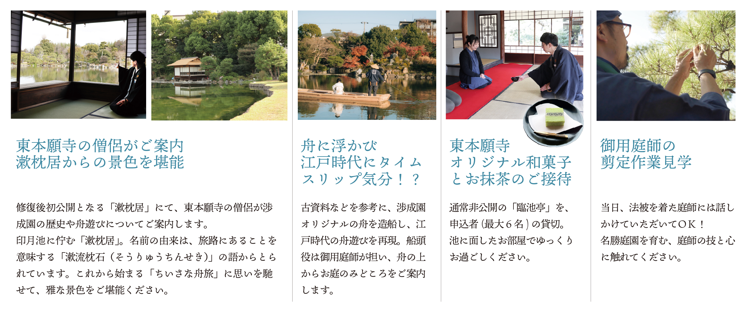 お出迎え(受付)~僧侶による渉成園のご説明~舟に乗船~お菓子お抹茶のご接待~庭園自由散策